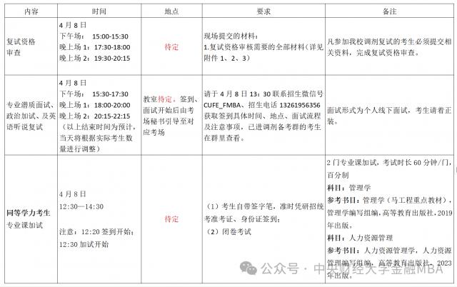 4 月 8 日 13:30 之后,通过微信号招生。 CUFE_FMBA、招生电话 13261956356、调整备考微信群获取具体的面试时间、地点和注意事项;