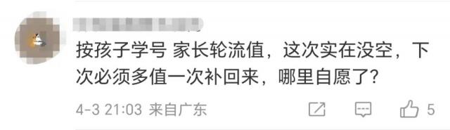 深圳父母 吴女士:值班是必须的,遇到非常特殊的情况,父母会在班级群里问,有空的父母能不能换一下。
