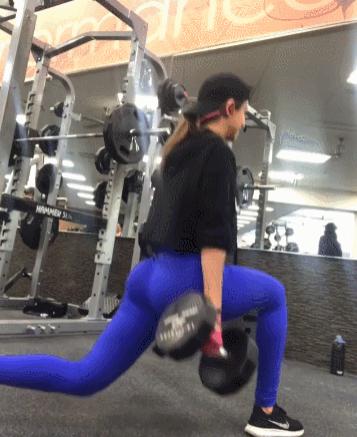 哑重箭步蹲,双手持哑铃自然下垂,做箭步蹲动作,增加体重,提高训练强度。