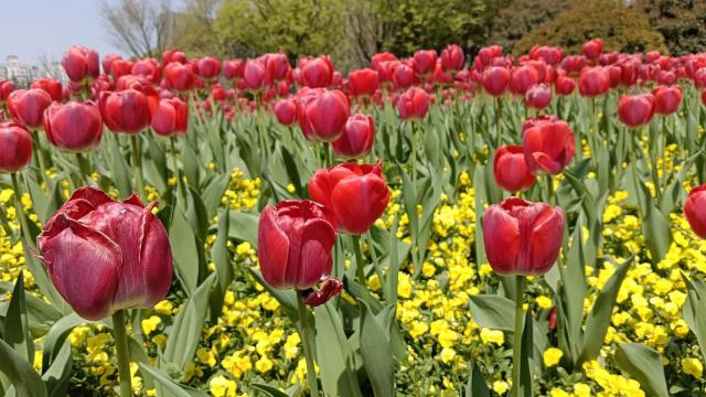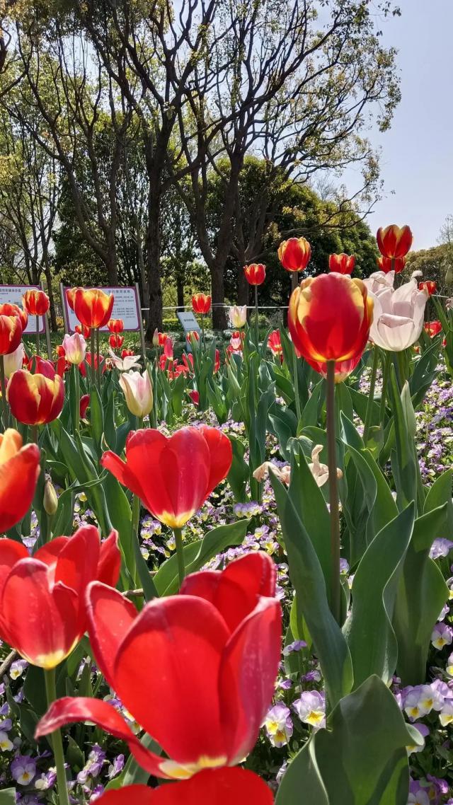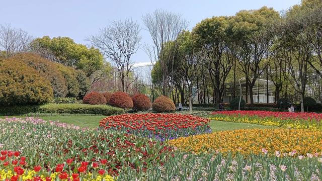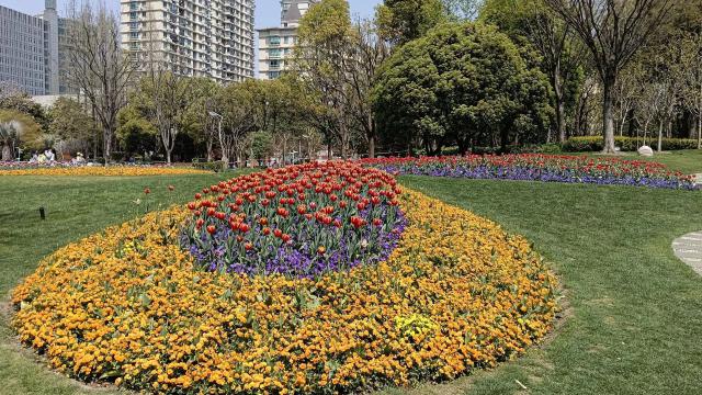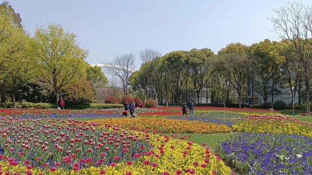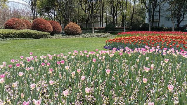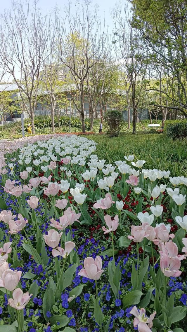 绿化中种植的各种郁金香鲜花盛开,游客穿梭其中,犹如徜徉在花海中。据工作人员介绍,南园滨江绿地位于黄浦滨江节点,在设计之初就吸收了“海绵城市”的理念。经过多年的培育和完善,错落有致的花海景观已经形成了固定的“花田”,非常有趣。