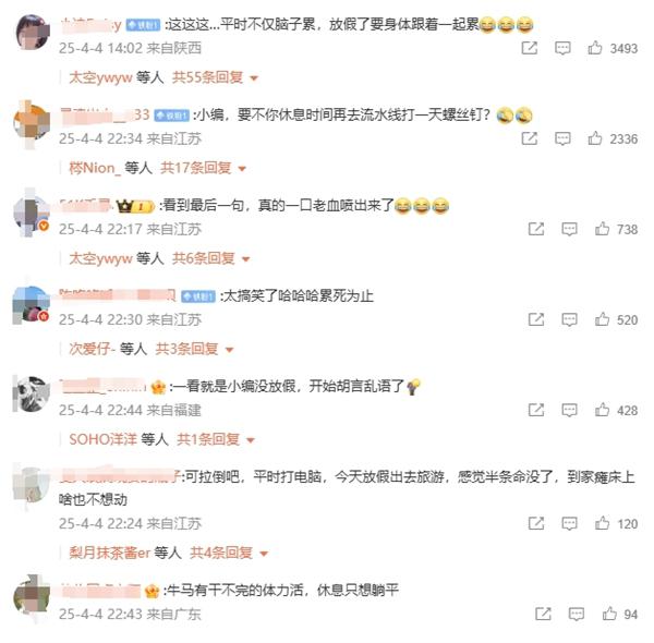 对此,有网友表示不赞同:“这个,这个,这个,这个……平时不仅脑子累,假期也累。”“看到最后一句话,一口老血真的喷了出来”。也有网友表示,“牛马有无尽的努力,只想休息后平躺”。