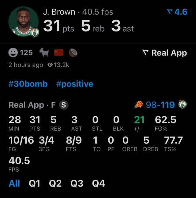 杰伦 - 布朗只打了 28 分钟 16 投 10 中间,轻而易举地拿到了。 31 分 5 板 3 助