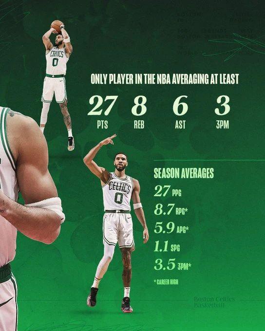 塔图姆本赛季场均 27 分 8 板 6 帮助,而且平均还可以投资。 3.5 记 3 分,NBA 他是历史上唯一一个能够实现这些数据的球员。