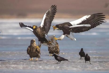 龙山湖、虎头海雕、白尾海雕等大型猛禽来到湿地,打破了早春湖面的宁静,让人早早感受到春天的气息。