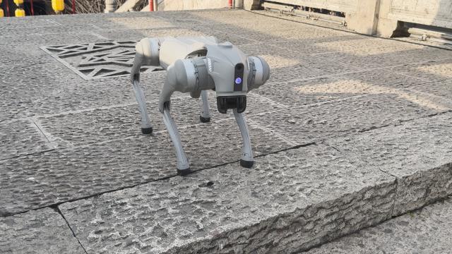 乍一看,机器狗的外观还是很科技的,整个银色的狗身,宇树官方表示,使用了大量的铝合金和工程塑料材料。