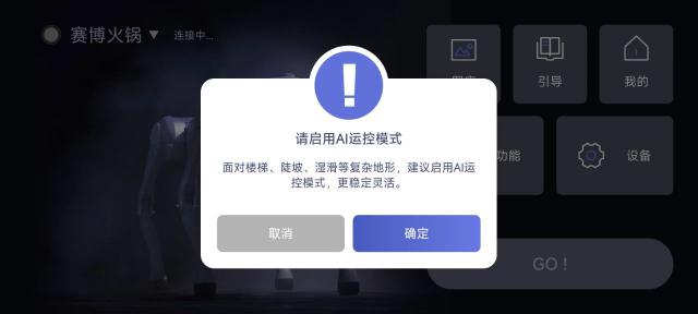 幸好后来我们发现了 App 里面有相关的提醒,启用 AI 运动控制模式能使其更加持久和灵活。翻车是因为没有 AI 赋能对吧?