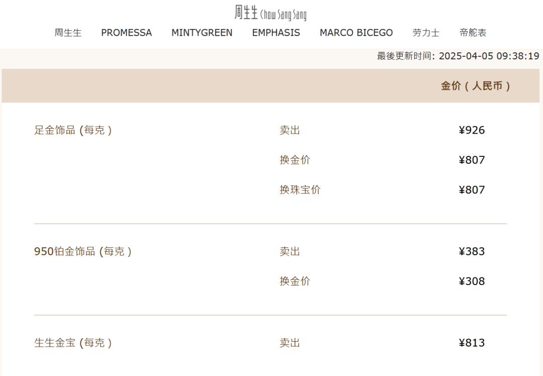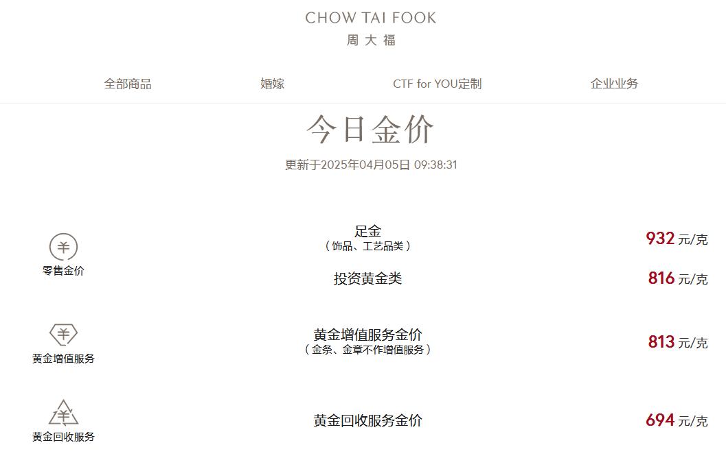 记者发现,4月5日,周大福的足金首饰零售价为932元/克,周生生的足金首饰为926元/克。