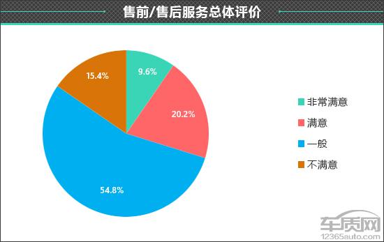 然而,在销售之前 / 在售后服务的整体评价中,接受调查的车主给出了客观的评价,其中认为“非常满意”的车主比例是 9.6%;感到“满意”的车主比例是 20.2%;感觉“一般”的车主比例最高, 54.8%;明确表示“不满”的车主比例为 15.4%。