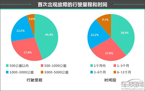 在这些非人为故障车辆中,第一次故障发生在里程行驶中。 500 占公里以内的比例最高, 44.4%的调查结果显示,38.9%的故障发生时间段 车主说汽车正在买车。 1 一个月之内就出现了故障。