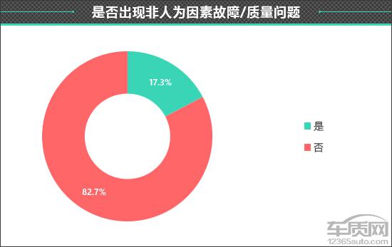 据调查结果显示,正在收到的 104 在有效的问卷中,有 18 一份问卷显示车辆出现了非人为故障或质量问题,比例为 17.3%。
