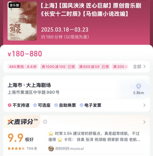 由于制作标准高,音乐剧《长安最长的一天》获得了制作标准。大麦 9.9 分极高口碑!创作团队以“简洁叙述” 重塑盛唐传奇的多元艺术,将 50 万字原本浓缩为 180 舞台传奇分钟!