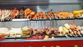 小吃摊主守护着准备好的食材。
