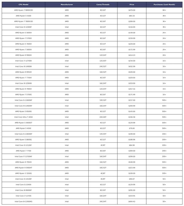 令人意想不到的是,入门级的六核锐龙 5 5500 还表现出色,售价不足。 90 美元,上个月销量超过 3000 颗粒排名第二,成为性价比极高的选择。