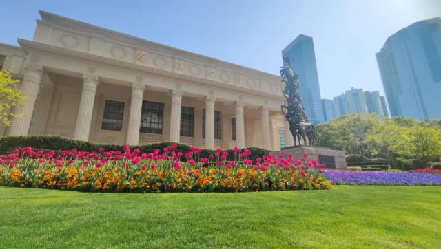 沿着南京西路向西走到上海展览中心,友谊会堂花坛前的大片郁金香花海特别耀眼。红杯状花瓣排列整齐,温暖的绽放,朝阳飞舞。