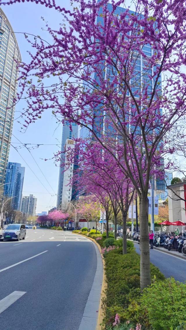 走在石门一路上面,抬头一看,绿树旁的整个树旁巨紫荆营造出紫烟般的视觉飓风,让路人上前仔细观察。紫色的花朵被串在一起,一阵春风吹过路边,掀起。层层的紫浪。