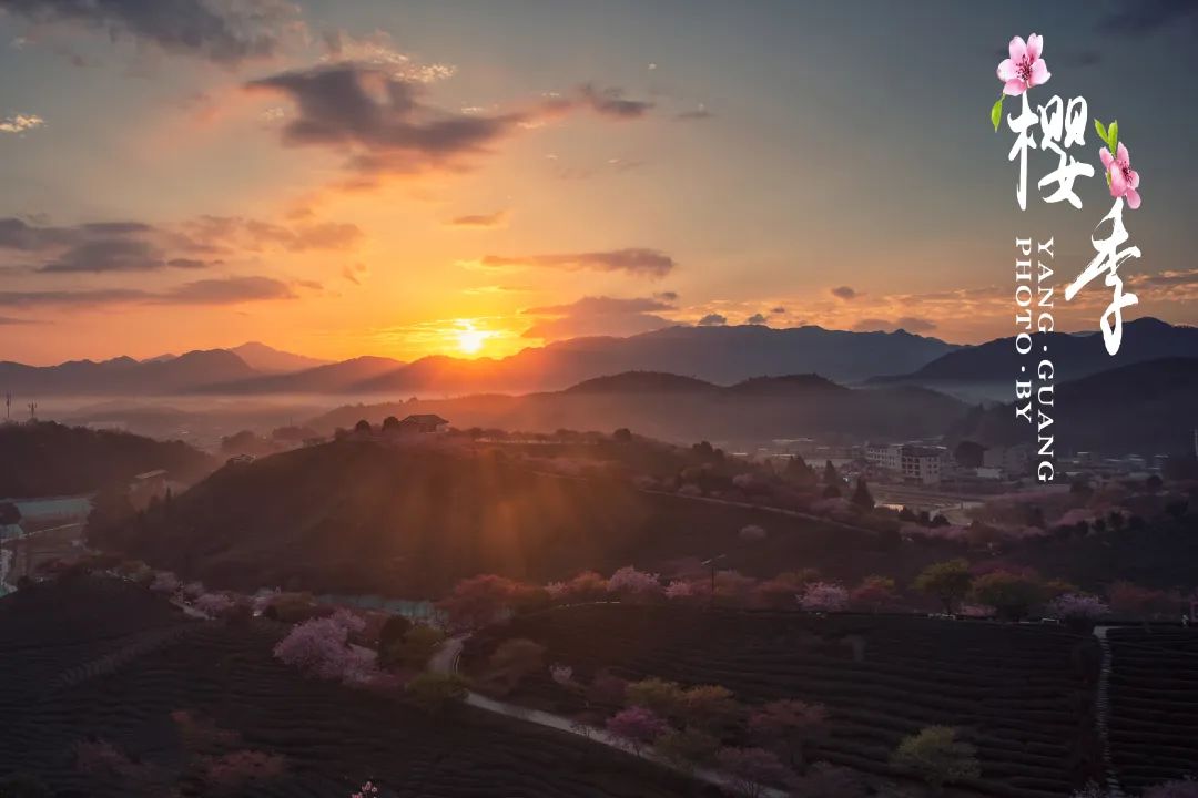 黎明时分,黎明微露,金色的阳光透过薄雾洒落在永福樱花园。在阳光的照耀下,粉色的樱花似乎被镀上了一层金边,闪闪发光。远处的青山在晨雾中若隐若现,与附近的樱花形成一幅梦幻般的画面。