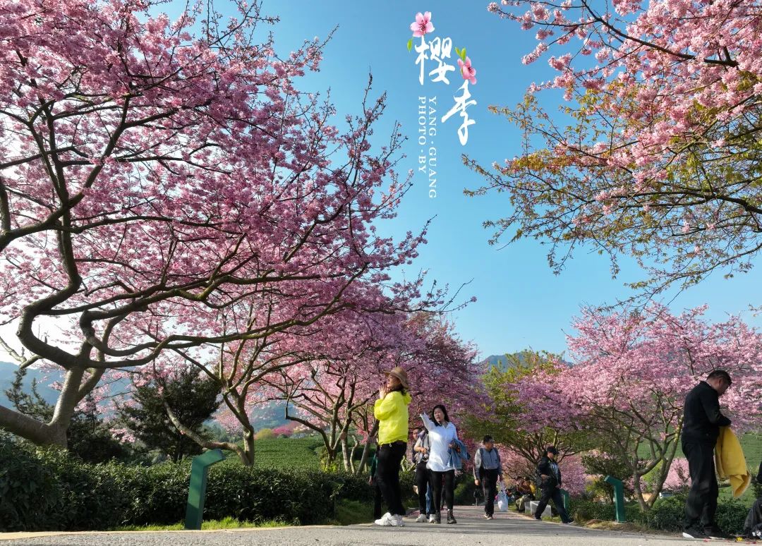 在春天温暖的阳光下,游客们沿着永福樱花园的樱花小路漫步,两边盛开着粉色的樱花。他们要么停下来观看,要么拍照留念,要么轻声细语,脸上洋溢着幸福的笑容。粉色的花瓣随风飘落,落在游客的肩膀和发梢,仿佛给他们披上了浪漫的樱花雨。