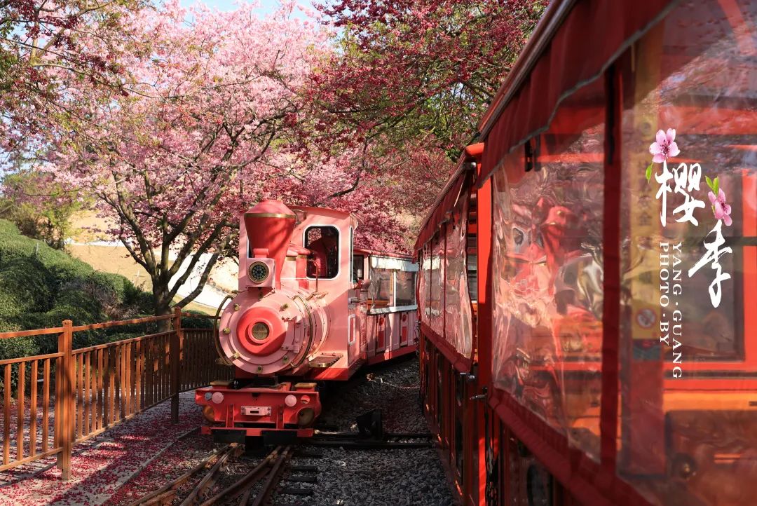 温暖的阳光投射着许多粉红色的樱花,包围着小火车,仿佛置身于粉红色的童话世界。火车来了,花瓣一个接一个地飘落,就像一场浪漫的樱花雨,令人陶醉。