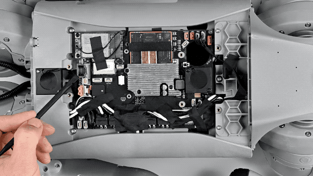 事实上,在这款机器狗内部,这种布基胶带的使用相当普遍,目的也很明确,机器狗磕磕碰碰很正常,而胶带可以固定线缆,防止连接器松脱。