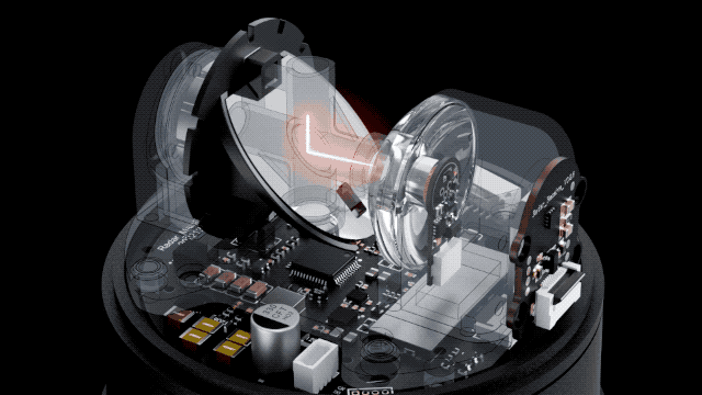 Lidar 模块的结构包含两个旋转轴:外圈的主旋转轴由下方电机驱动,实现水平扫描;内部的次级旋转轴(带有一个反射镜)快速旋转,实现垂直方向的扫描切片。两者结合,提供环境的 3D 视图。
