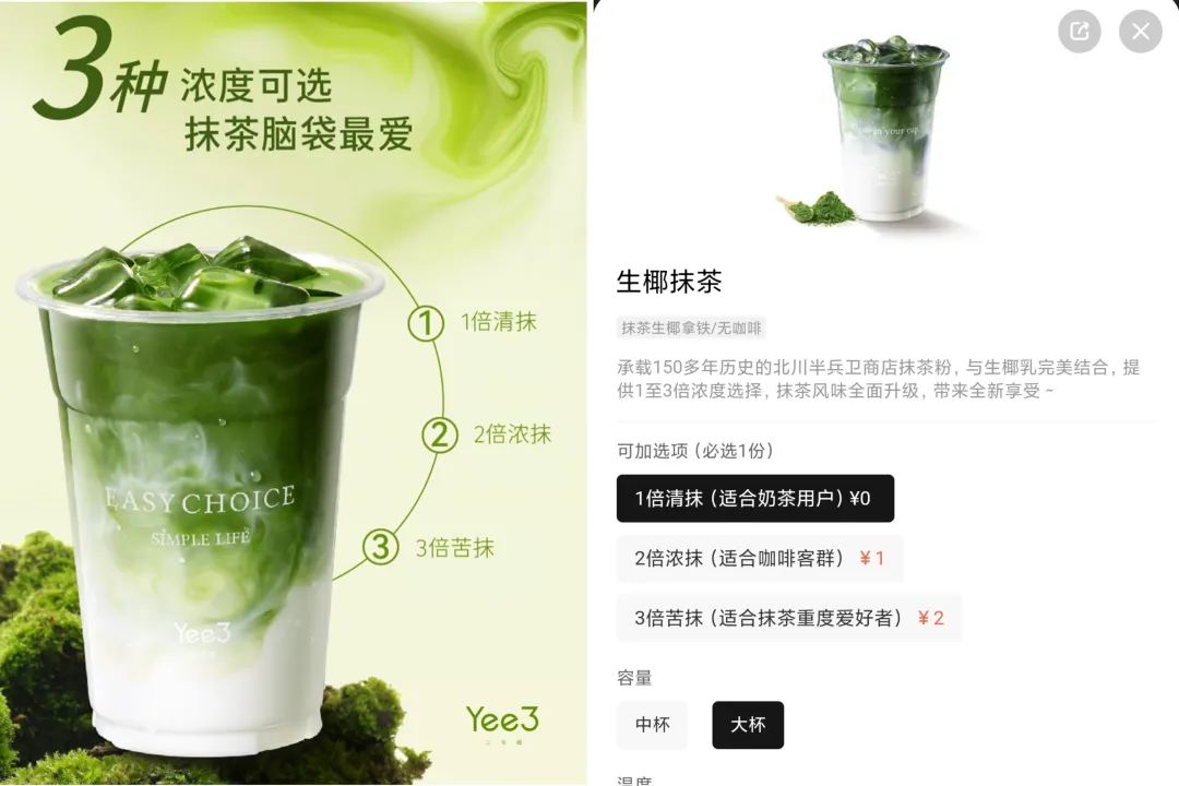 Yee3近期升级推出的抹茶系列,生椰抹茶有3种抹茶浓度可选,一倍清抹适合奶茶用户,二倍浓抹适合咖啡客群,三倍苦抹适合抹茶重度爱好者。
