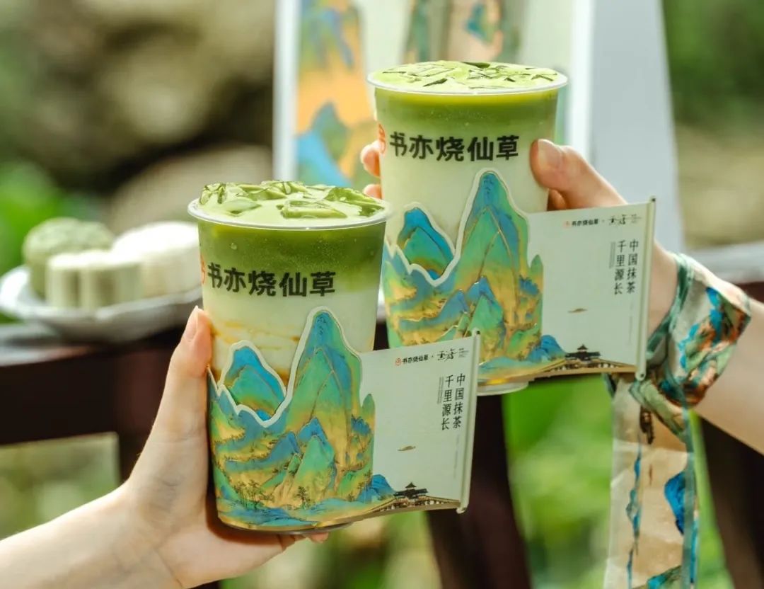 书亦烧仙草则与画游千里江山联名,以千里江山图的相关元素做宣发,极具东方美学色彩。两款抹茶新品,皆有前缀“中国抹茶”。