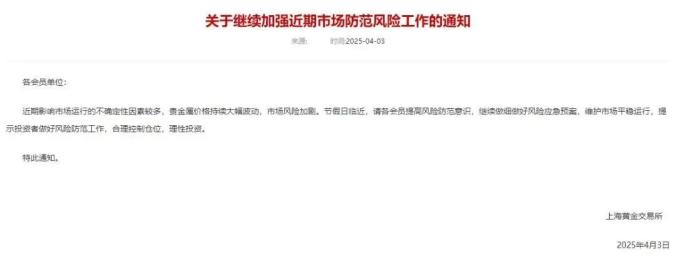 4月3日,上海黄金交易所发布《关于继续加强近期市场风险防范的通知》,指出近期影响市场运行的不确定性因素较多,贵金属价格持续大幅波动,市场风险加剧。请各成员提高风险防范意识,继续做好风险应急预案,维护市场稳定运行,提醒投资者做好风险防控工作,合理控制仓位,合理投资。