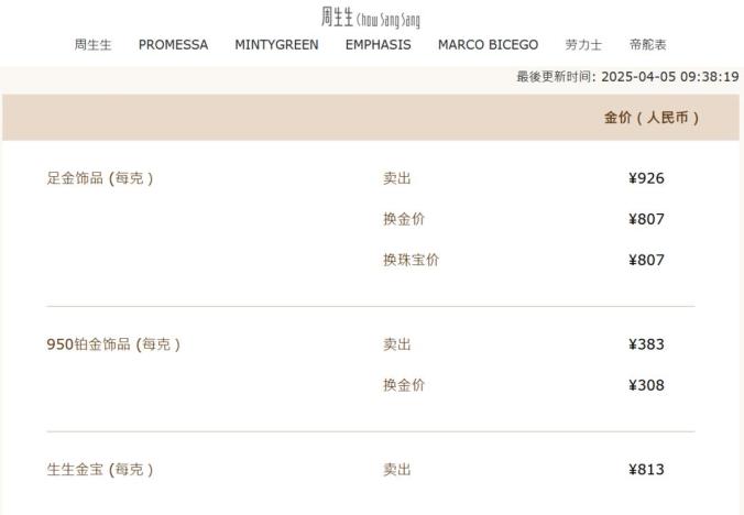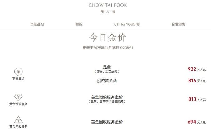 与前一天948元/克的价格相比,周生生足金首饰的价格下降了22元/克,2天下降了32元/克。老庙黄金足金首饰定价931元/克,比前一天946元/克的价格下降了15元/克,2天下降了30元/克。周大福足金首饰定价932元/克,比前一天下降了20元/克。