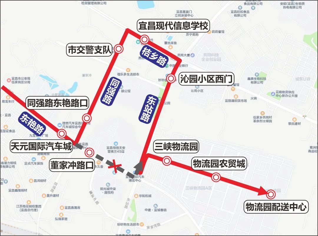 向三峡物流园方向:线路运行至东艳路与同强路交叉口后左转,经同强路、桔乡路、东站路转入三峡物流园。