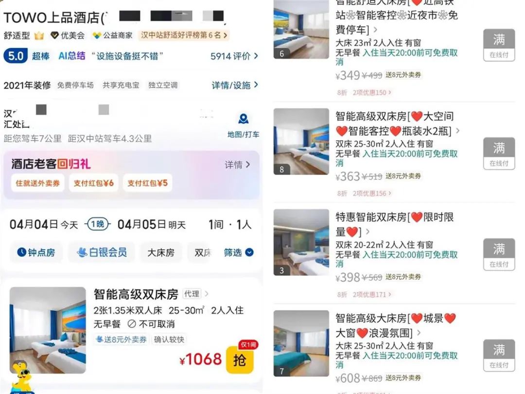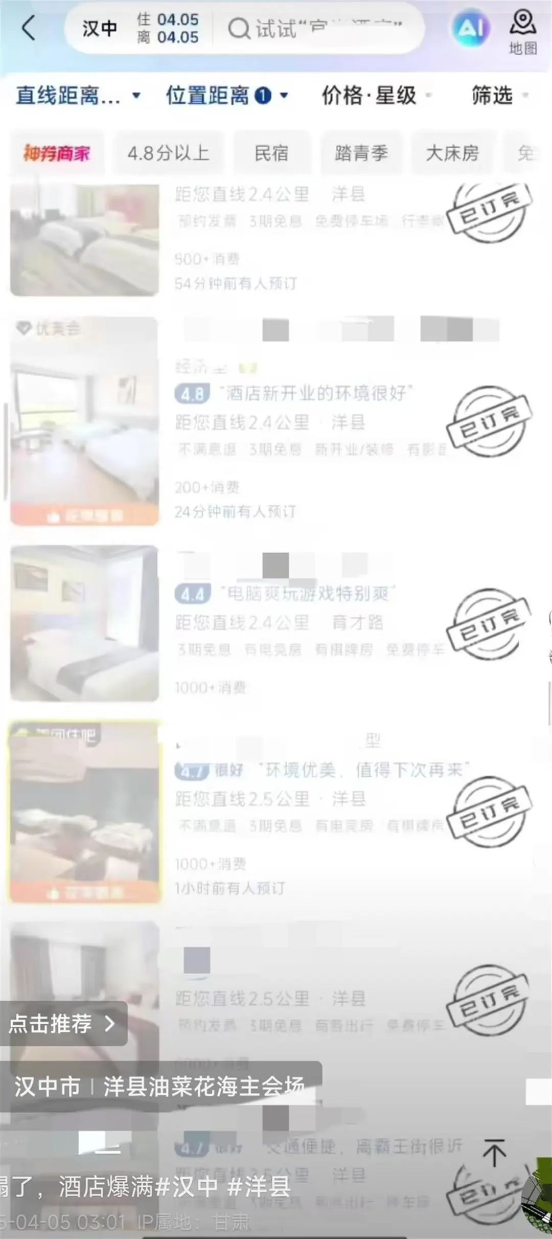 油菜花节会场勉县艾斯国际酒店一名工作人员表示,清明节假期第一天,汉中城区、勉县等多个县的酒店预订确实出现了爆款订单,房价上涨,甚至很难找到房间。“比如我的酒店涨了100元左右。然而,一些游客在街上睡觉是夸张的。”5日晚,记者通过百度地图查看酒店,房价500多元,有房。