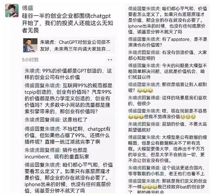 两年前,朱啸虎和傅盛围绕ChatGPT创业的话题,在朋友圈隔空“争论”。当时,朱啸虎站在投资者关注回报的立场上,直言不讳地说:ChatGPT对创业公司非常不友好。请在未来两三年内放弃你的融资想象。