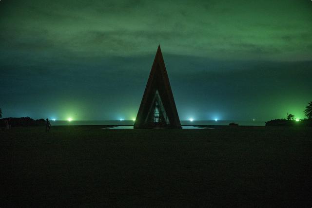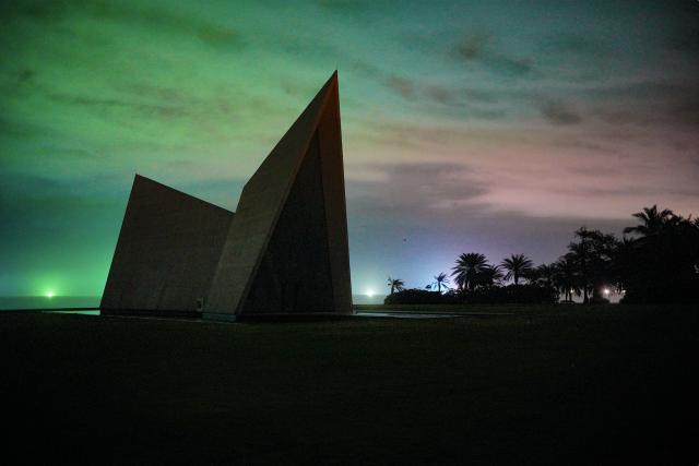 本来想拍完融创教堂的日落就撤离了,结果晚上渔船的灯光一亮,竟有一种离谱的、极光的华丽效果。