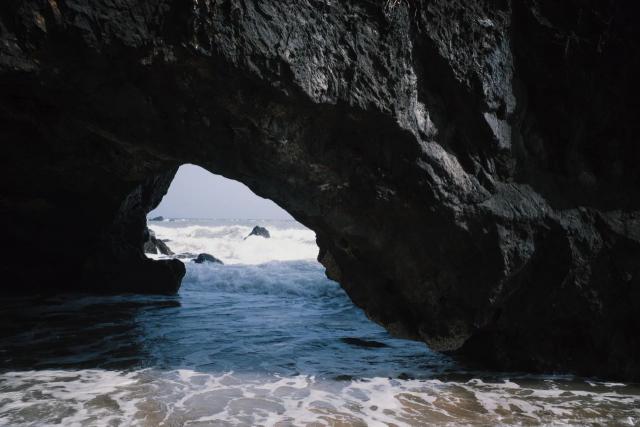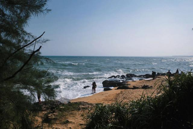 这儿实际上是一片野沙滩,有很多黑色的岩礁,还有一个燕子洞,确实可以拍出非常有电影质感的照片。