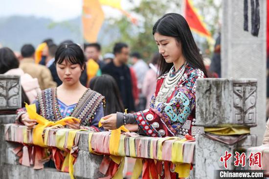 △图为人民绑祈福带。中新社记者 瞿宏伦 摄