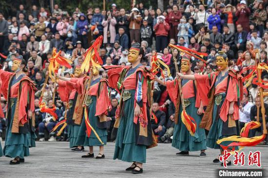 △图为祭祀仪式“乐祭”中的舞蹈表演。中新社记者 瞿宏伦 摄