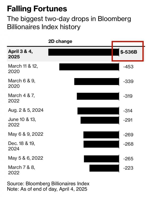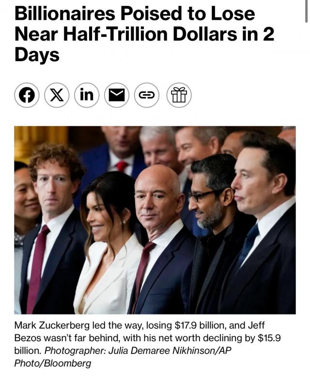 据彭博 . 社 4 月 4 据日报报道,在美国总统特朗普宣布新的关税措施导致全球市场暴跌后,世界上最富有的是 500 人们在两天内遭受了“彭博亿万富翁指数”史上最大的损失。