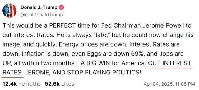 在鲍威尔发表演讲的同一天,特朗普 4 月 4 日本以能源需求和通货膨胀减少为由,在社交平台上发文催促美联储尽快降息。