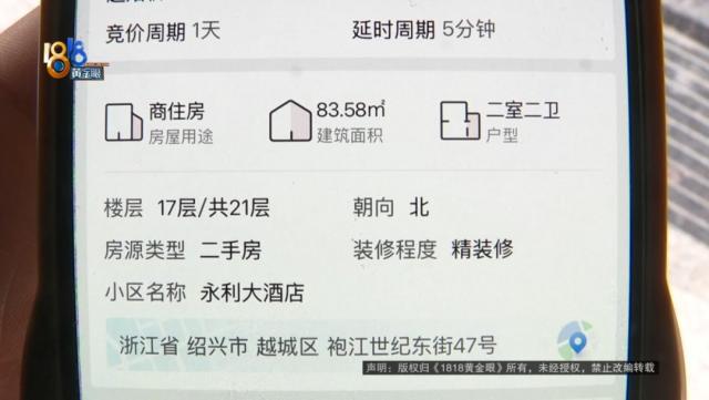 据刘女士介绍,她平时住在杭州拍卖平台上。看看绍兴世纪东街。永利大酒店 1702 室,建筑面积 83 平方左右,3 月 30 号她以312300 元拍下价格,目前已缴纳。 5 一万元保证金。