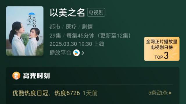 播出第一天,收视率破裂 1.9上映后,收视率保持成功,位居全网第三,实力非凡。这部剧是贾静雯和姚晨主演的现任剧《以美的名义》。
