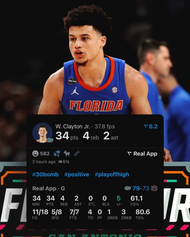 双能卫小沃尔特弗罗里达大学 - 克莱顿 18 投 11 中,3 分球 8 投 5 中间,砍掉了整场比赛最高的。 34 分,还有 4 个篮板 2 个助攻。