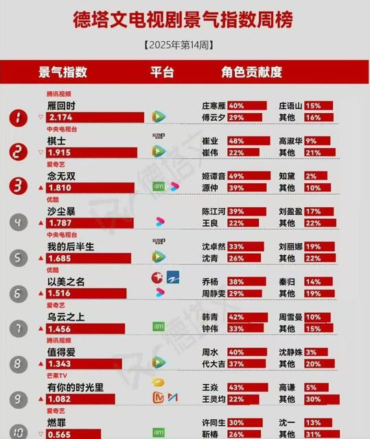 德塔文公布了新一期电视剧形势热榜,《燃烧罪》登上了最后一班车,挤进了前十名榜单。更名后,几乎没有公布的《雁回时》风靡一时,排名第一!