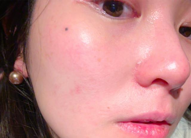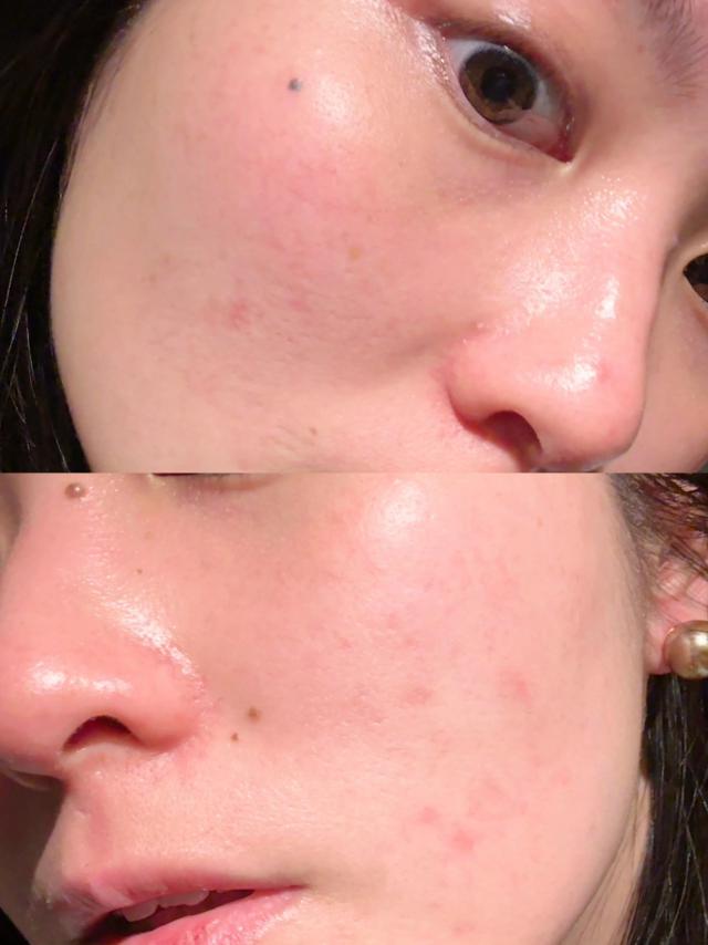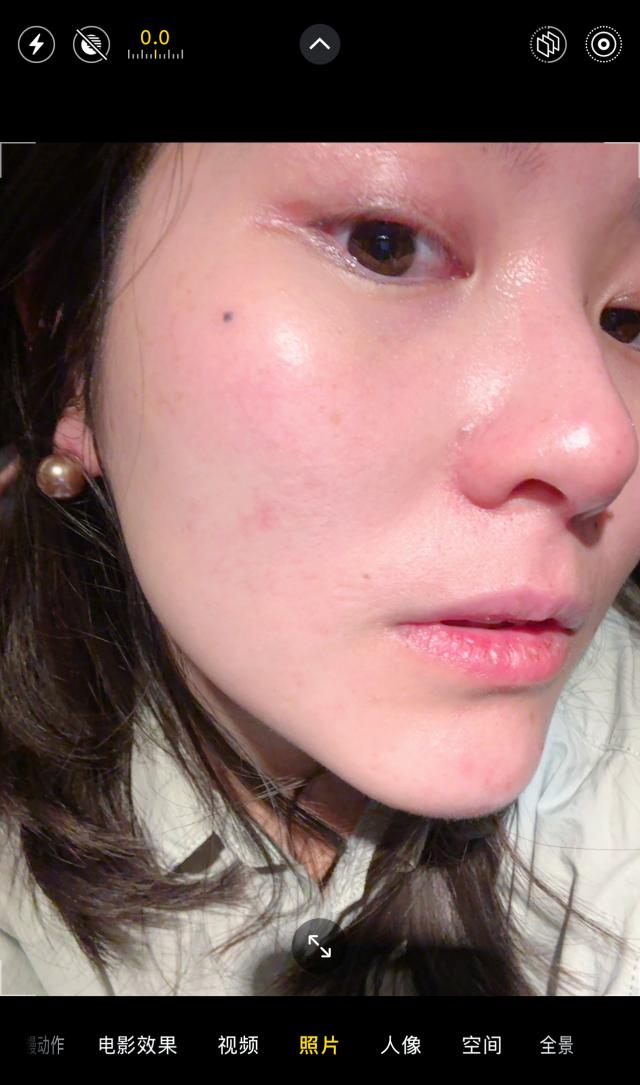 这张照片看起来并不明亮。我在原相机的自然黄光下拍摄的视频,真的是全脸无死角的数量,特别闪亮。� � 痘印依然存在,但整张脸的光泽度确实闪闪发光。