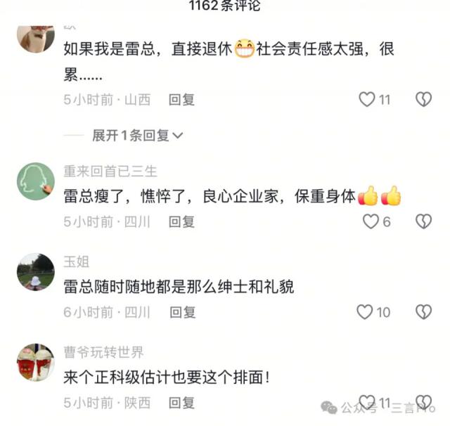 网民评论:“雷总瘦了,憔悴了”,“军队都憔悴了,心痛了一分钟”,“没有以前那种快乐的感觉”。