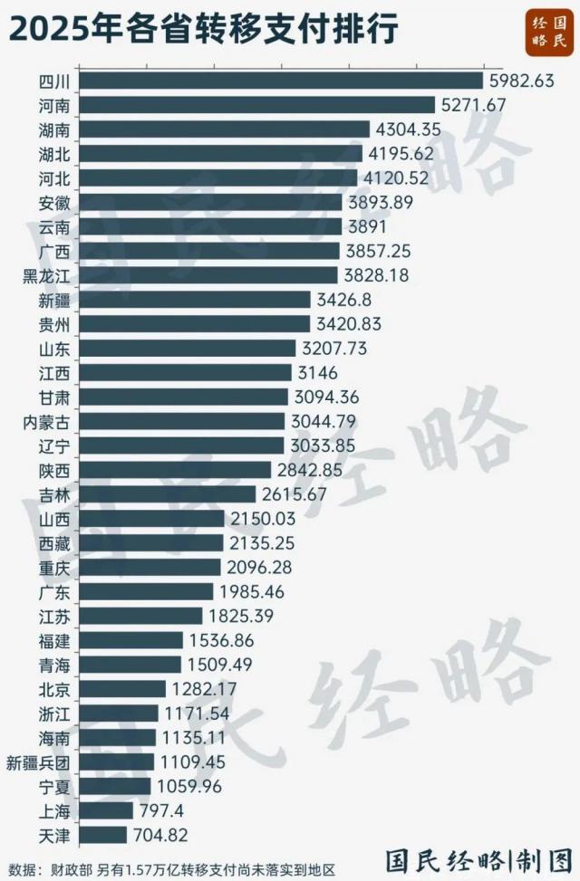 分别由四川、河南决定 5983 亿元、5272 连续多年占据前两名的亿元,成为财政转移支付的最大受益者。