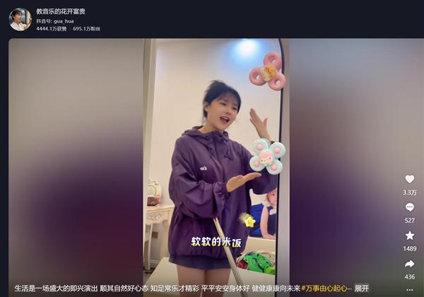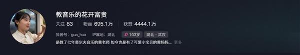 截至目前,黄老师(个人账号:教音乐的花开富贵)短视频平台粉丝数时 695.1 万,点赞 4444.1 万。