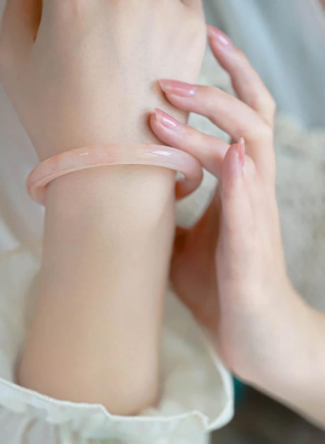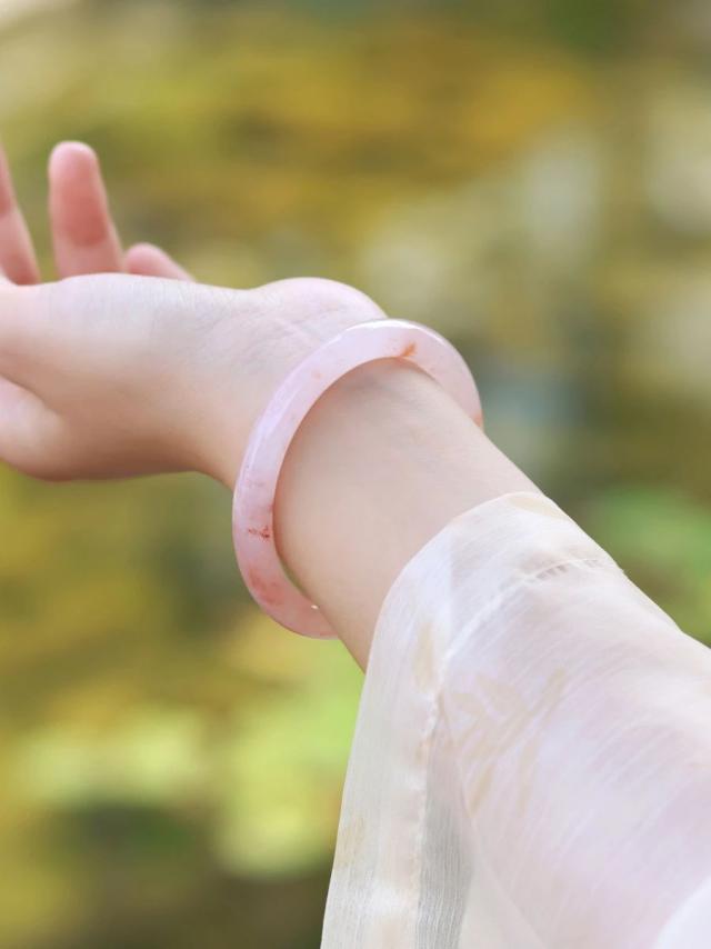 手腕间一抹藕粉轻轻摇动,仿佛可以触及江南烟雨的温柔,或枝头新蕊与暖阳的私语。——