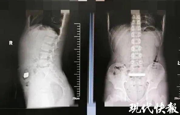 据悉,“吞金”后,小钱感觉腹部轻微疼痛,没有剧烈疼痛或其他不适。父母发现后,立即带他们去苏州大学附属儿童医院急诊科就医。经 X 片状检查,医生发现一个密度极高的金属物体停留在其消化道内,结合病史被诊断为“消化道异物”。