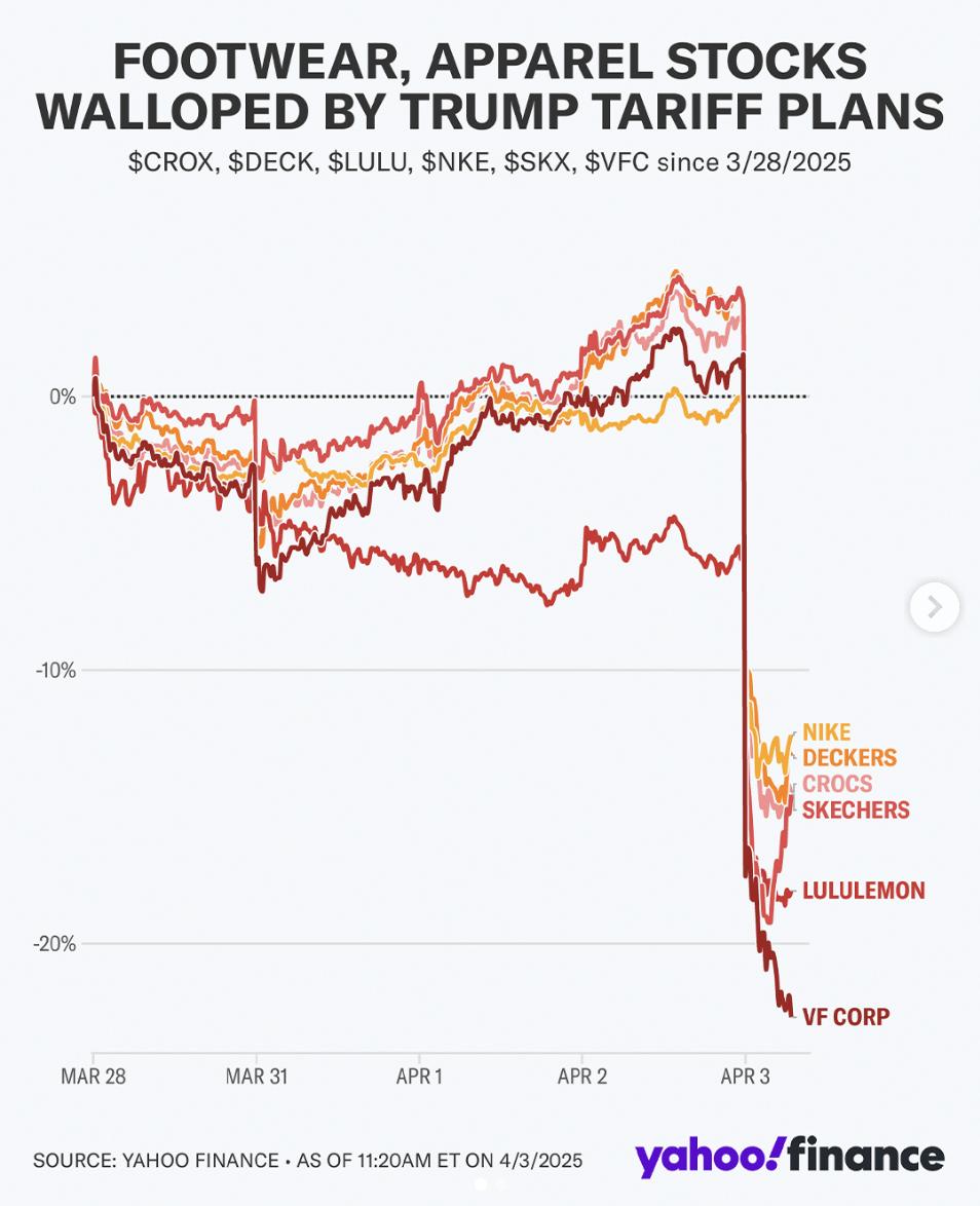 在关税发布之日,耐克股价收盘下跌14%,市值蒸发超过138亿美元。阿迪达斯股票下跌了10%,彪马股票下跌了10%左右,lululemon、斯凯奇、安德玛和On的股票下跌幅度在11%到17%之间。
