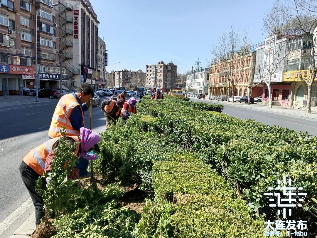4月5日上午,位于西南路与龙江路交叉口。沙河口区市政中心绿化维护人员正在补充道路中间的绿化带绿色植物。在补充种植的同时,工人们严格控制种植深度、株距等细节,同时做好浇水、施肥等维护工作,确保苗木存活率。