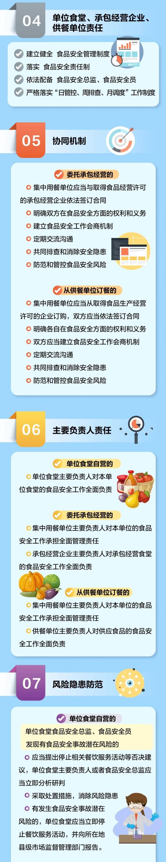 第二,明确单位食堂、承包经营公司、配餐单位的食品安全主体责任。规定单位食堂、承包经营公司、餐饮单位应当建立健全食品安全管理制度,落实食品安全责任制,依法配置食品安全总监、食品安全员;同时,考虑到学校和幼儿园的独特性,学校和幼儿园也应当配置食品安全总监,以满足学校和幼儿园的一定要求。规定单位食堂、承包经营公司、配餐单位应当认真落实“日控、周调查、月调度”工作制度。明确违反《规定》要求的学校、幼儿园,应当从重处理。